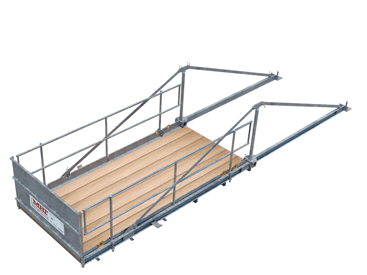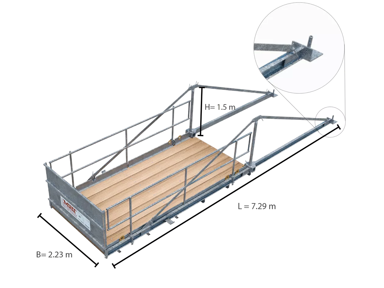 Auskragende Arbeitsbühne mit einer Nutzlast von 20 kN (2.0 to) und einer Arbeitsfläche von 4.0 x 1.80 m. Transportgrösse: Länge = 4.15 m, Breite=2.44 m, Höhe = 0.53 m