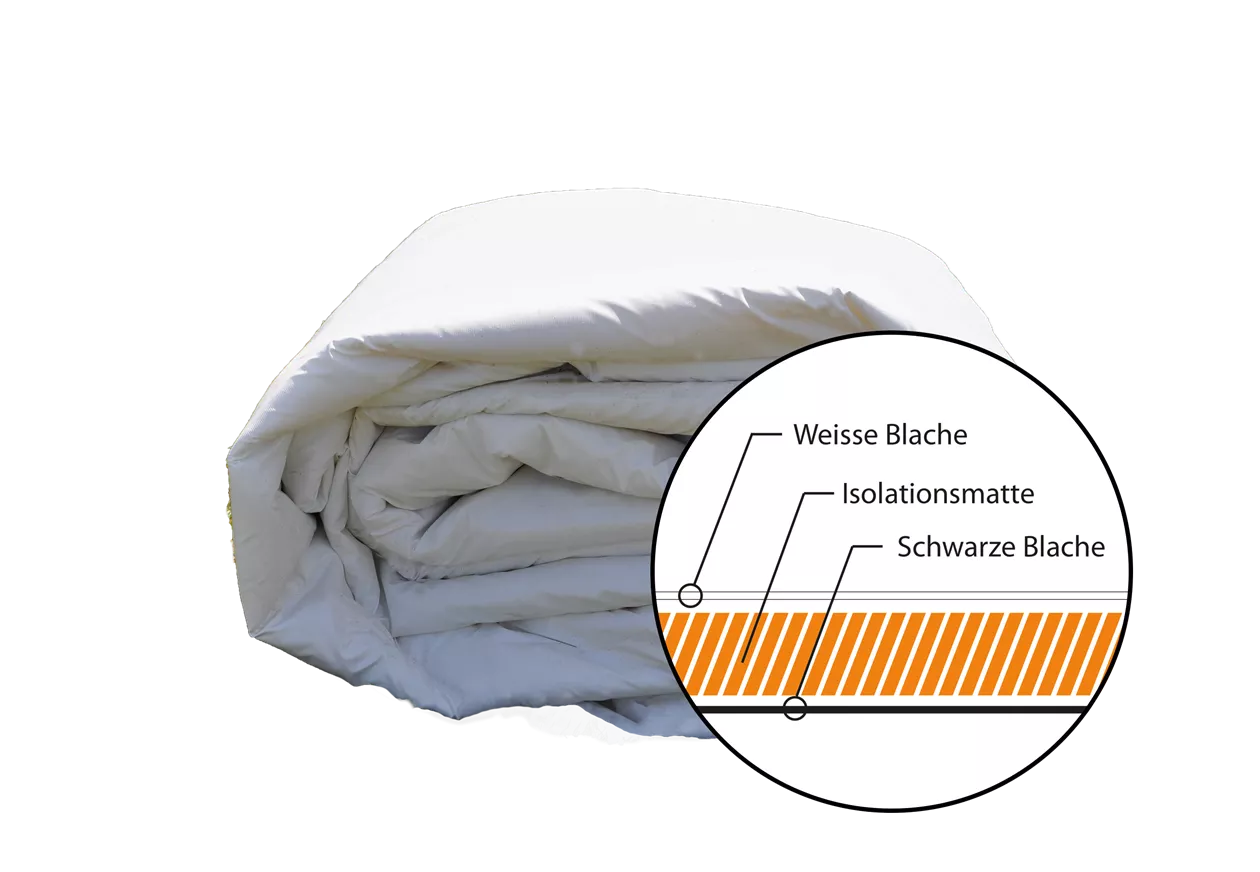La bâche de déneigement de 6×6 m SnowThermo Top est constituée de deux toiles de bâche très résistantes dotées de tapis isolants soudés, de sangles cousues, de coins renforcés et de quatre anneaux de suspension. Elle supporte également les charges de neige les plus importantes.