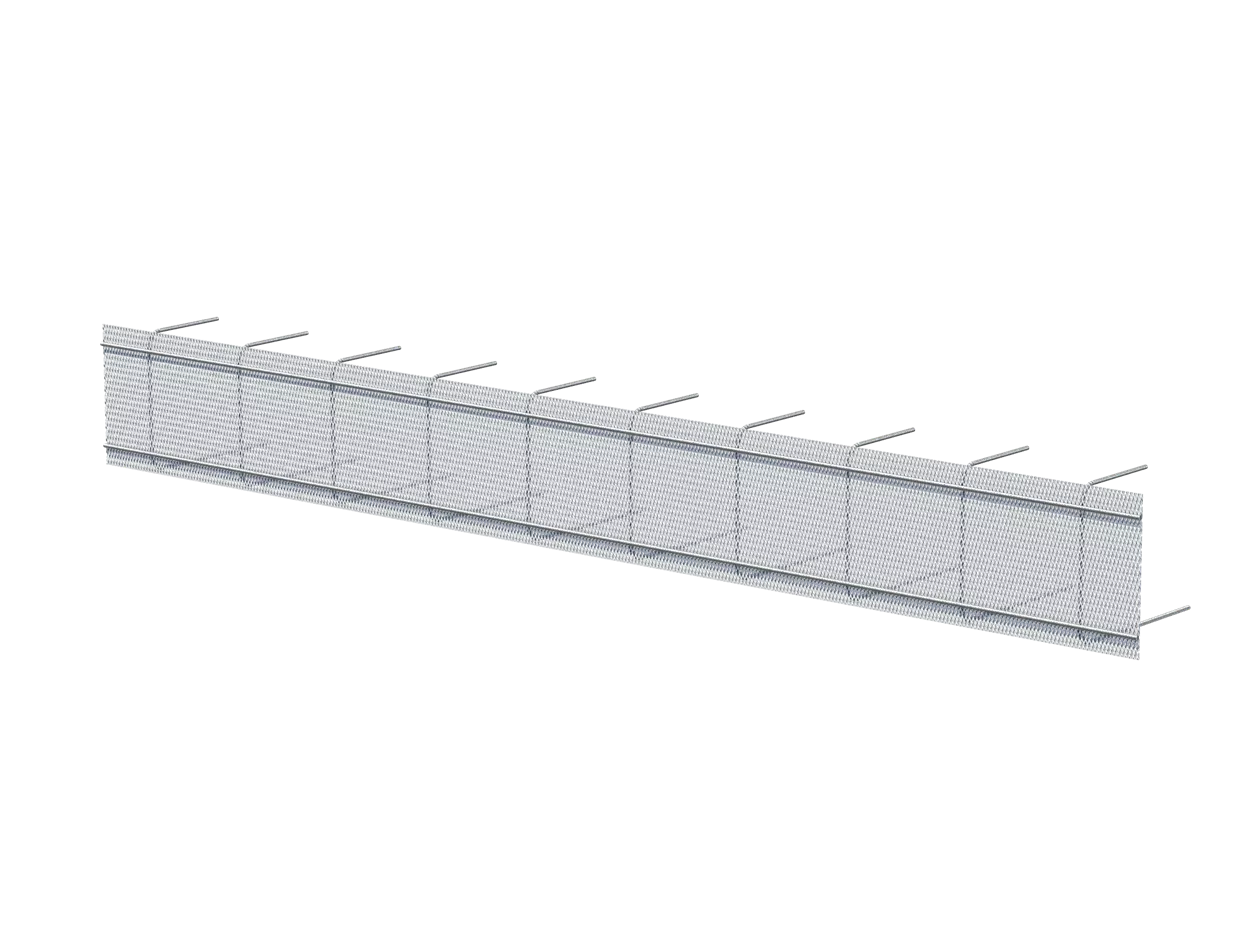 L’élément de coffrage en métal déployé AES permet le coffrage simple et rapide d’un joint de construction avec possibilité de monter un tuyau ou un canal d'injection. Pour obtenir une arête inférieure propre, un rail d'écartement avec pièce d'appui fermée (par ex. un rail Net-Form, art. 1771) est placé avant la pose de l'armature inférieure. Cela crée une arête de béton droite et garantit l’enrobage souhaité de l'armature. L' élément de coffrage AES en métal déployé est ensuite fixé à l'armature inférieure à l'aide de ligatures. Les troisième et quatrième couches de l’armature peuvent ensuite être posées sur l'élément AES.