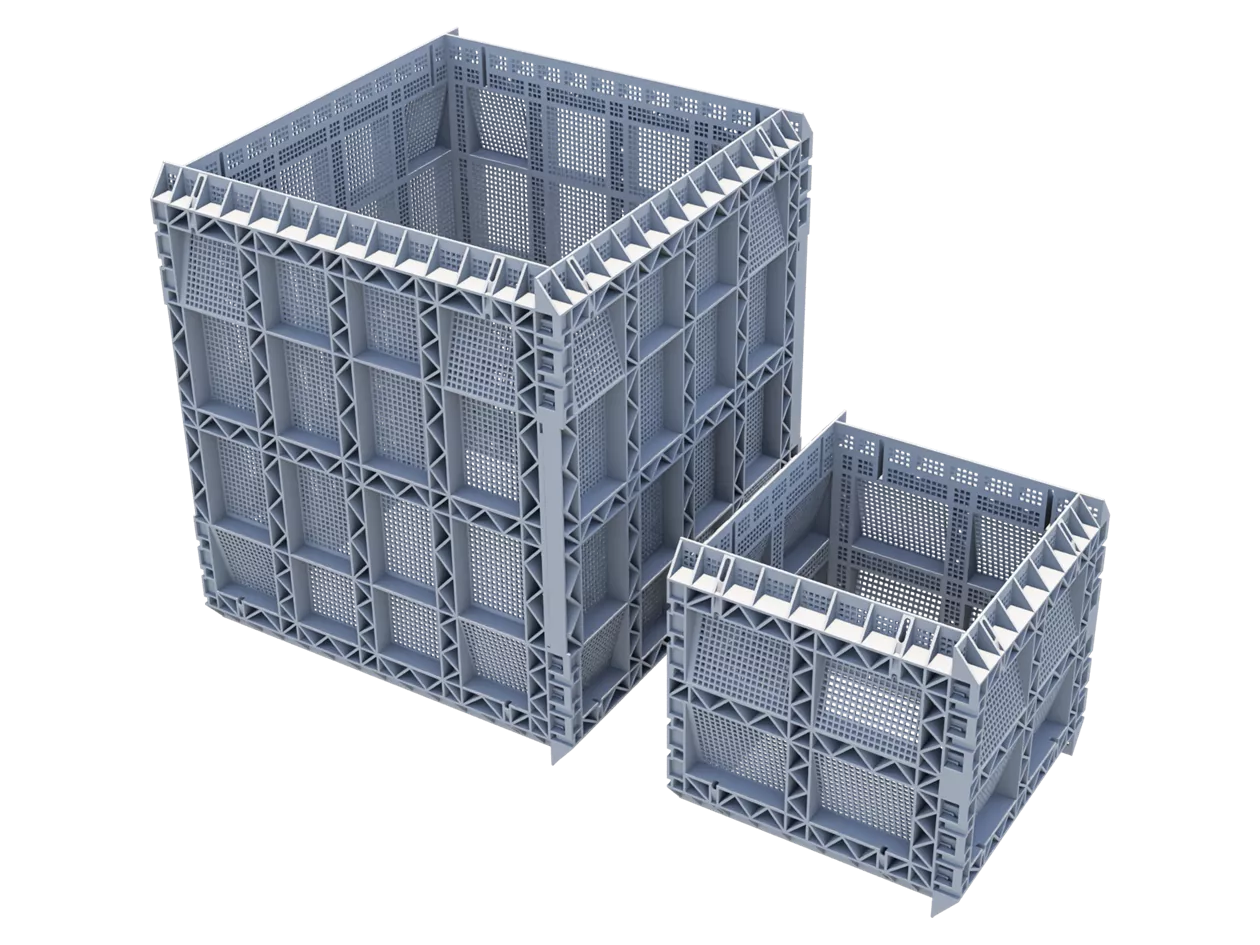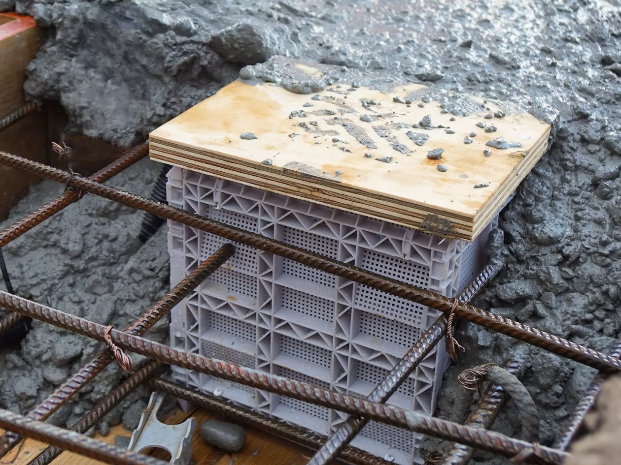 Avec seulement trois largeurs de parois de Steck-Box par hauteur, les 36 tailles de réservation possibles allant de 15 x 15 à 50 x 50 cm peuvent être rapidement et facilement emboîtées les unes dans les autres et clouées sur le coffrage avec un couvercle en bois. Après le bétonnage, la Steck-Box reste dans le béton, ce qui permet de se passer du décoffrage – qui prend beaucoup de temps – ainsi que de l’élimination des matériaux de coffrage conventionnels, tels que le bois et le polystyrène.