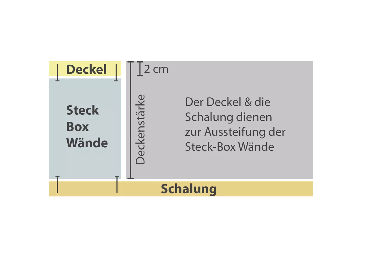 Avec seulement trois largeurs de parois de Steck-Box par hauteur, les 36 tailles de réservation possibles allant de 15 x 15 à 50 x 50 cm peuvent être rapidement et facilement emboîtées les unes dans les autres et clouées sur le coffrage avec un couvercle en bois