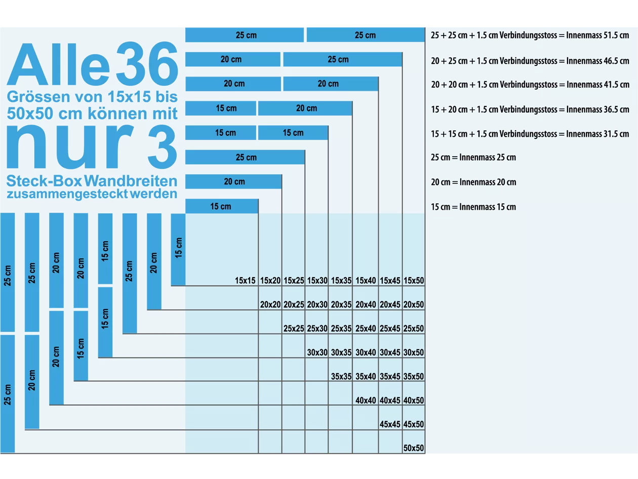 Les trois largeurs des parois de la Steck-Box 15, 20 et 25 cm sont disponibles dans les hauteurs 18, 20, 22, 23, 24, 25, 26, 28, 30 et 32 cm. Elles peuvent être emboîtées les unes dans les autres de manière modulaire avec un angle de 90° ou de 180°, et elles peuvent être complétées par le couvercle de Steck-Box d’une hauteur de 2 cm.