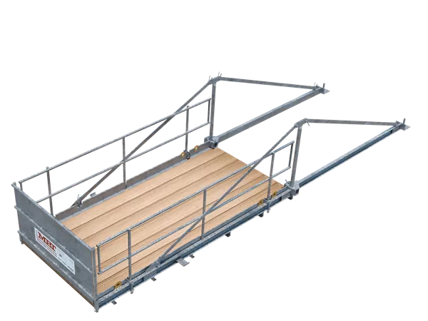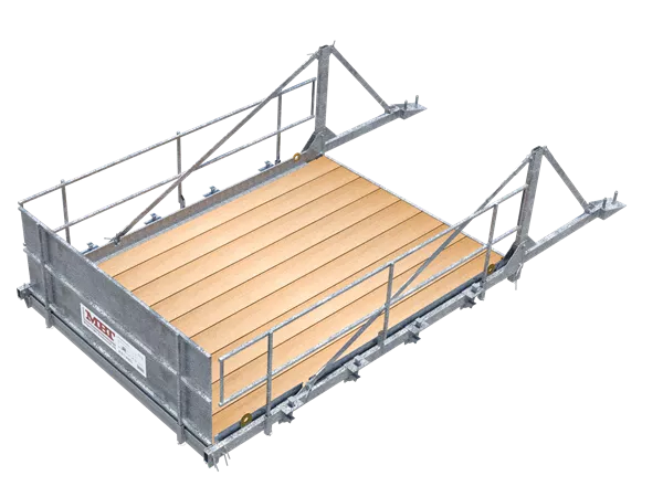 Plateforme de travail en console pour le transport et le déchargement de tous les matériaux de construction à tous les étages, dans la construction de bâtiments d’habitation ou industriels.  Avec la grue, elle est simplement mise en place à l‘étage souhaité et fixée à l‘aide d‘étais de soutien et d‘ancrages DW. Grâce au système de surtension, la construction peut, selon le type, supporter une charge comprise entre 2 et 4 tonnes.