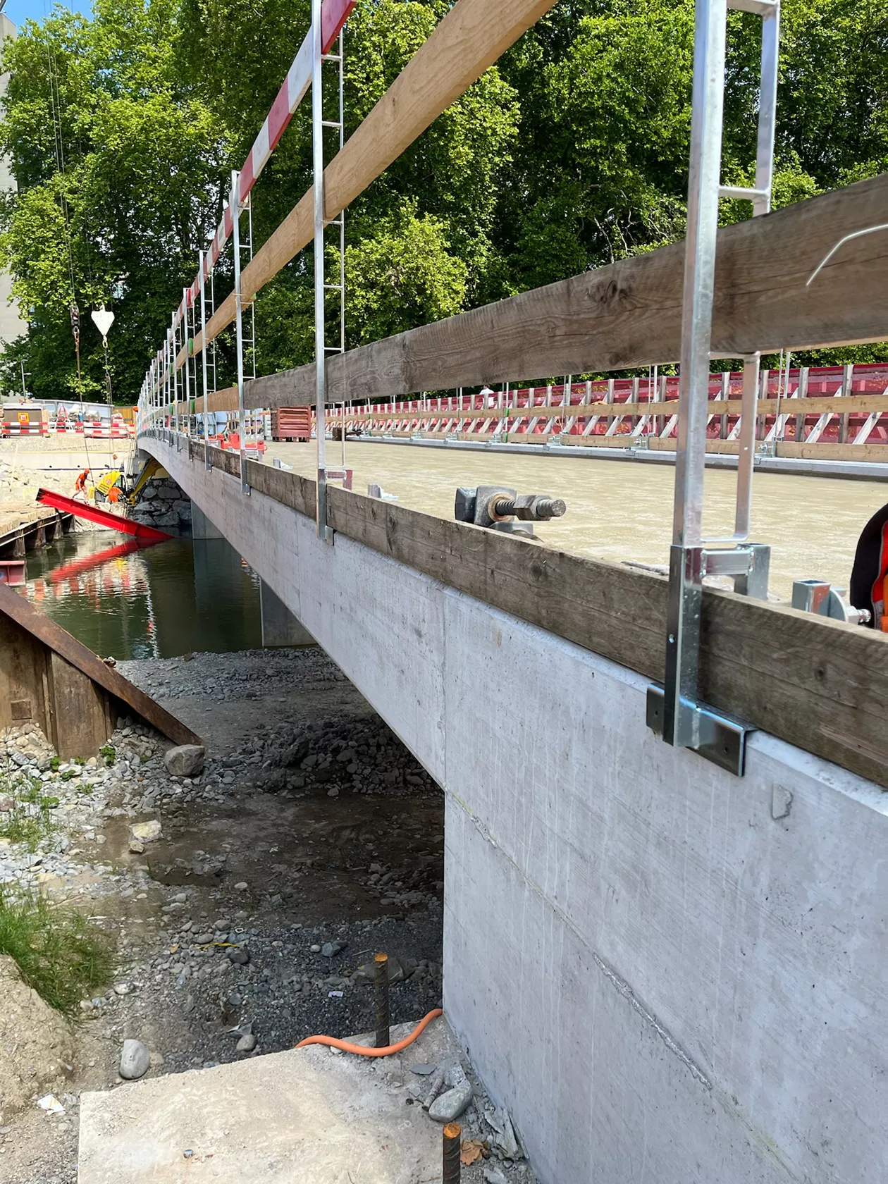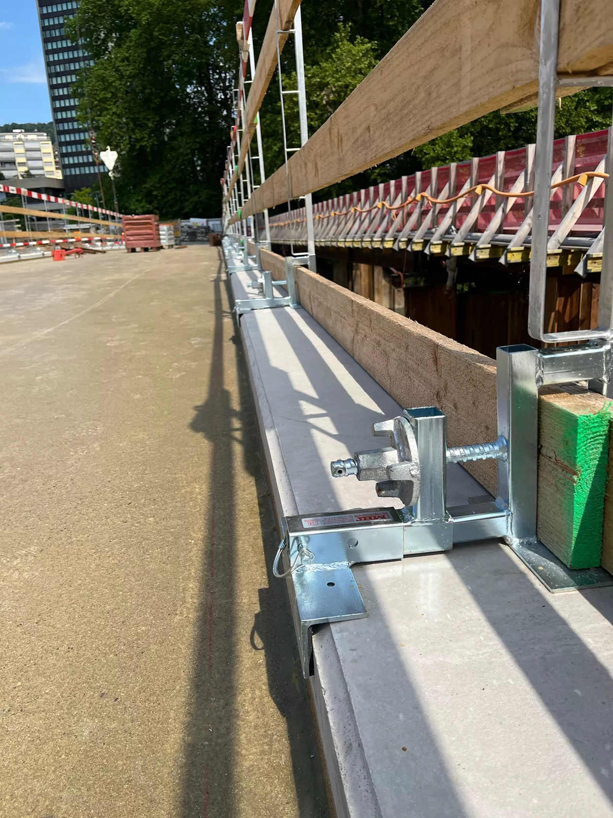 Grâce à la hauteur de serrage minimale requise de 6 cm et à la saillie minimale de la pince de parapet, les travaux tels que la pose d’un revêtement, des travaux d’étanchéité, etc., peuvent être effectués sans problème à l’intérieur des ponts. La tête de pont reste en grande partie entièrement dégagée, ce qui permet de monter les glissières de sécurité de manière efficace et sûre.